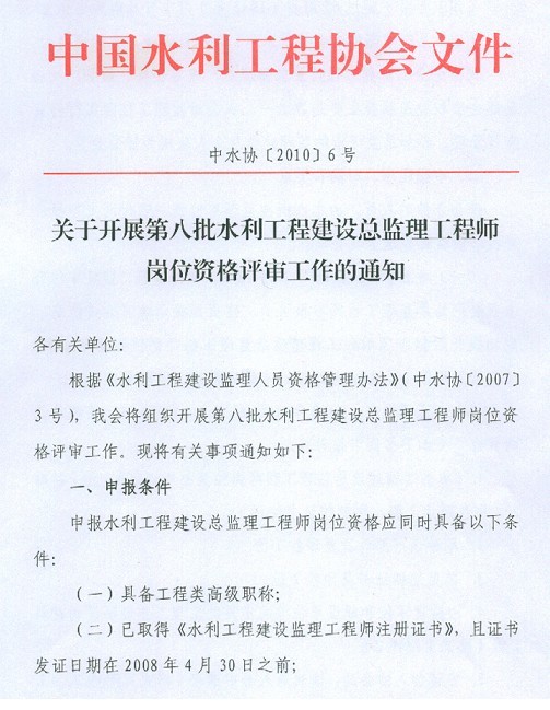关于开展第八批水利工程建设总监理工程师岗位资格评审工作的通知