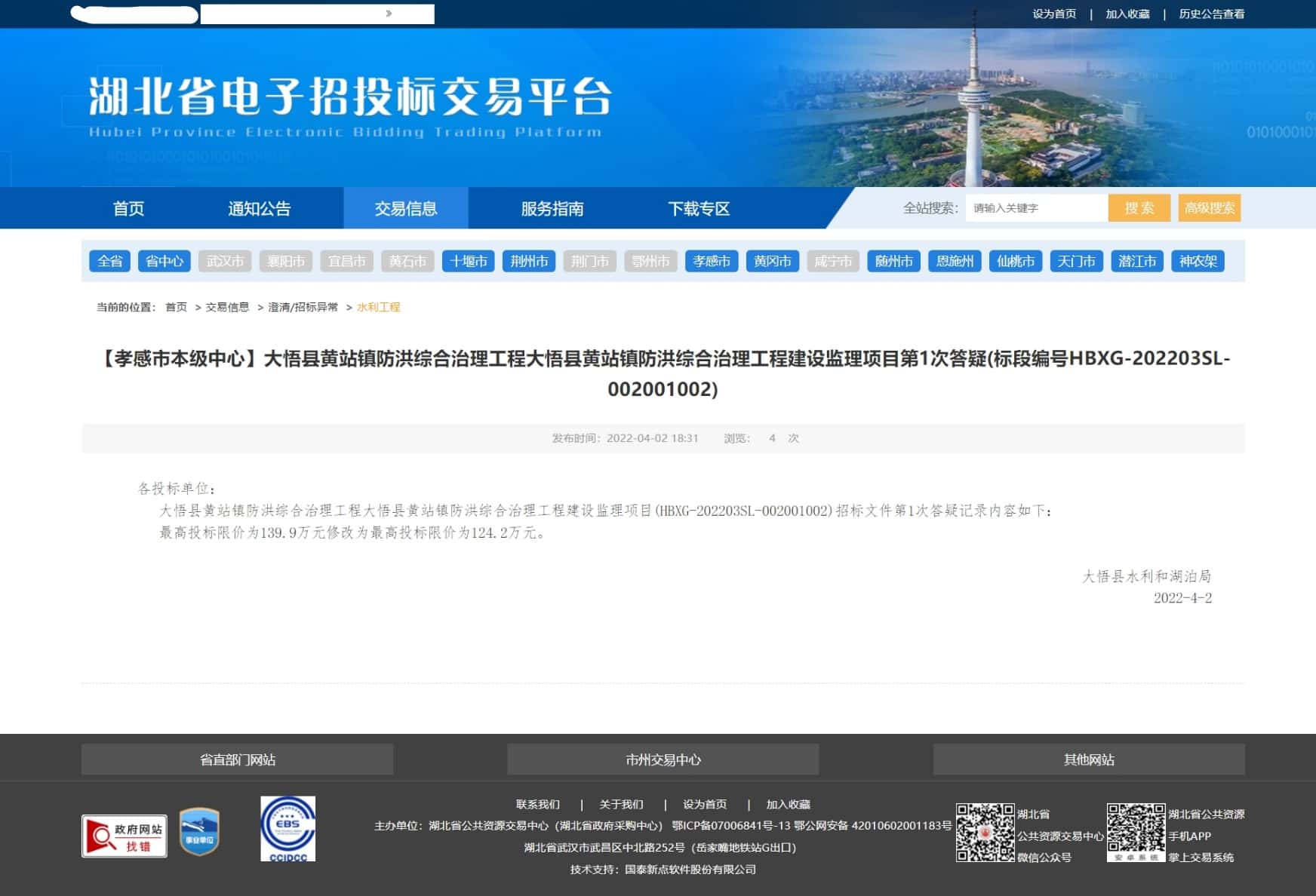 大悟县黄站镇防洪综合治理工程大悟县黄站镇防洪综合治理工程建设监理项目(HBXG-202203SL-002001002)招标文件第1次答疑记录内容如下:   最高投标限价为139.9万元修改为最高投标限价为124.2万元。
