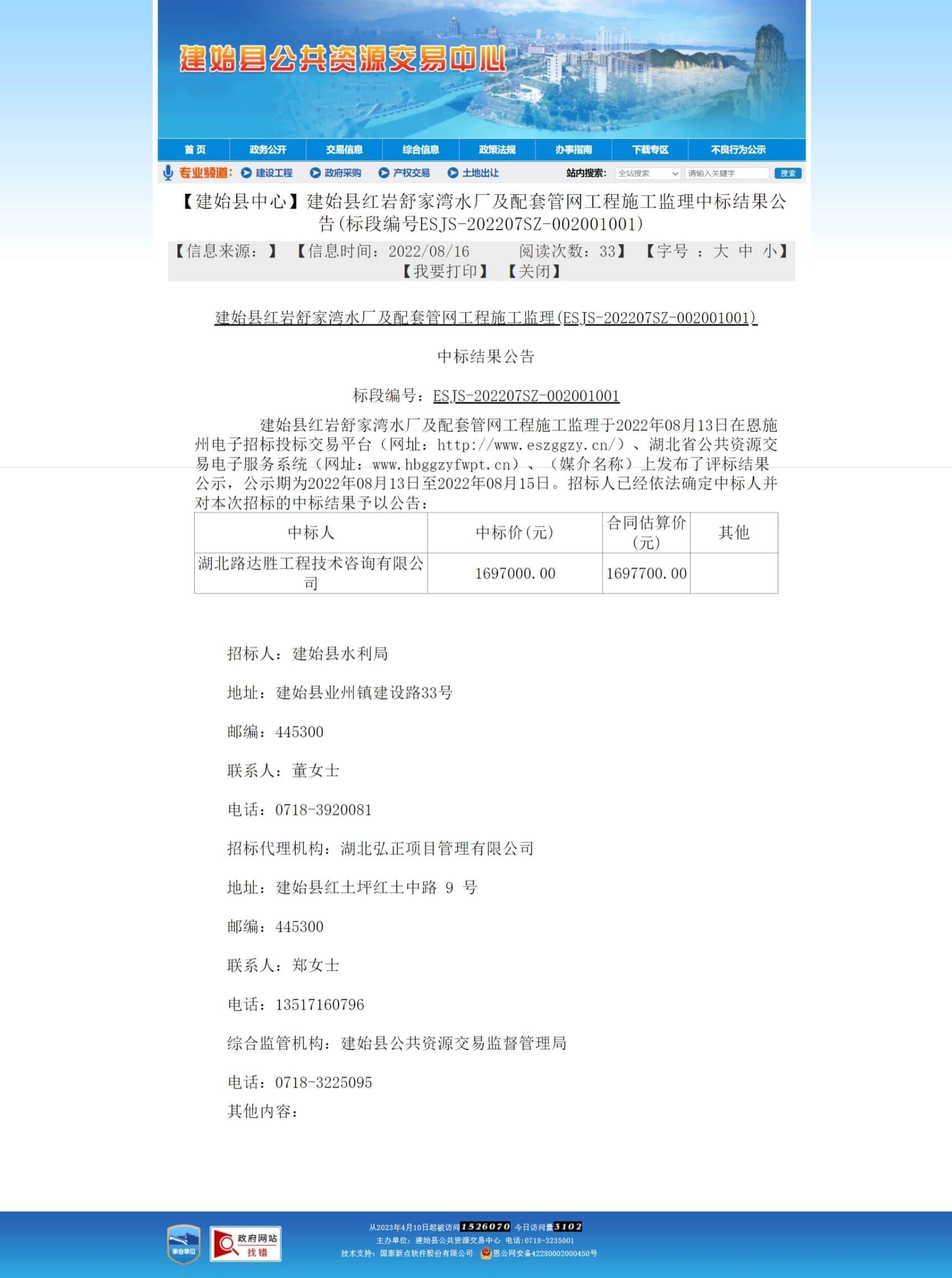 建始县红岩舒家湾水厂及配套管网工程施工监理中标结果公告