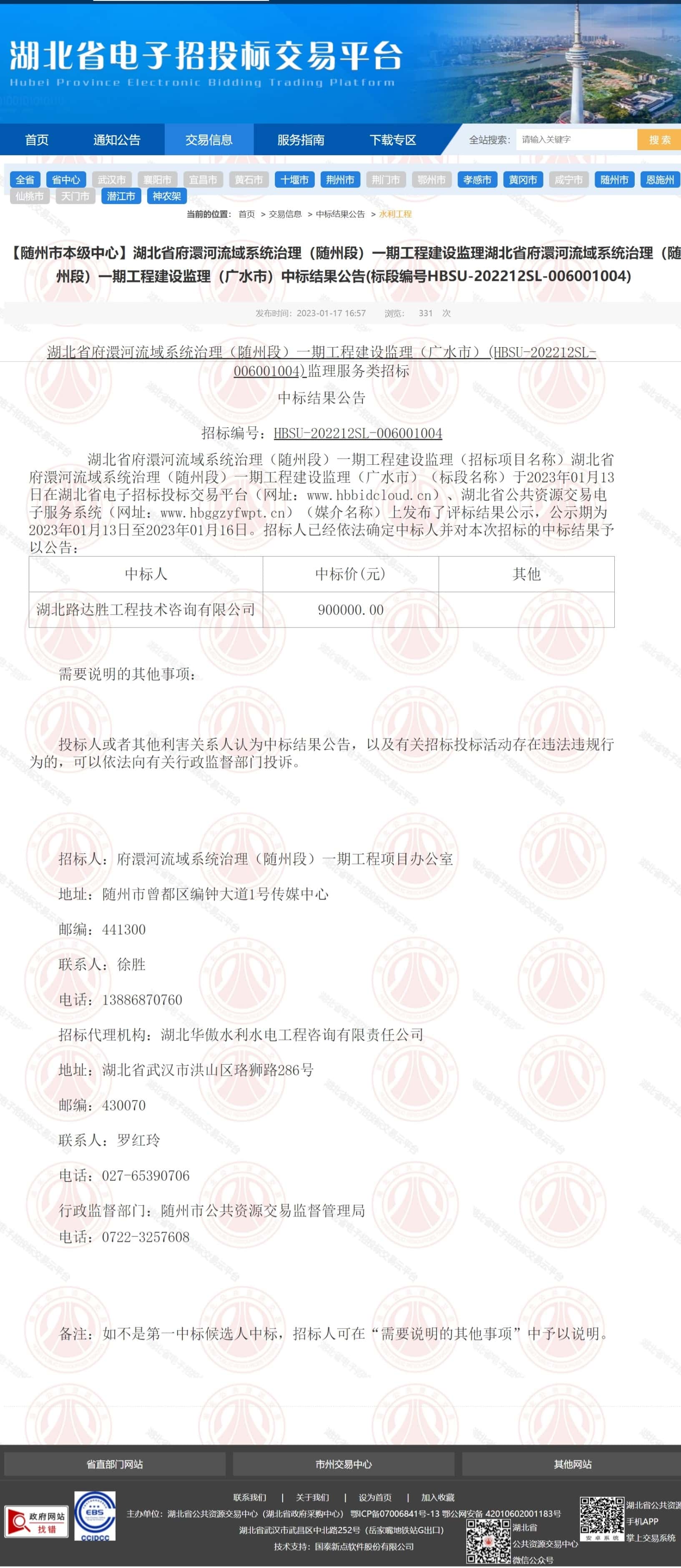 湖北省府澴河流域系统治理(随州段)一期工程建设监理(招标项目名称)湖北省府澴河流域系统治理(随州段)一期工程建设监理(广水市)(标段名称)于2023年01月13日在湖北省电子招标投标交易平台(网址:www.hbbidcloud.cn)、湖北省公共资源交易电子服务系统(网址:www.hbggzyfwpt.cn)(媒介名称)上发布了评标结果公示,公示期为2023年01月13日至2023年01月16日。招标人已经依法确定中标人并对本次招标的中标结果予以公告: