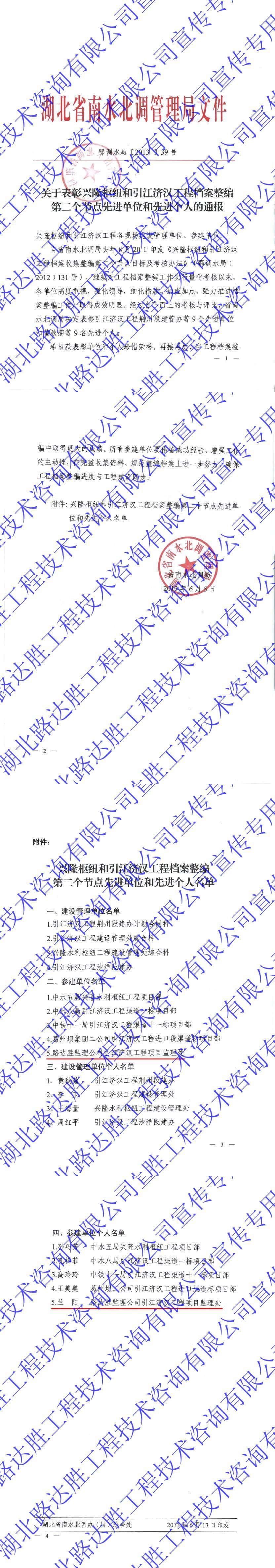 兴隆枢纽和引江济汉工程档案整编第二个节点先进单位和先进个人