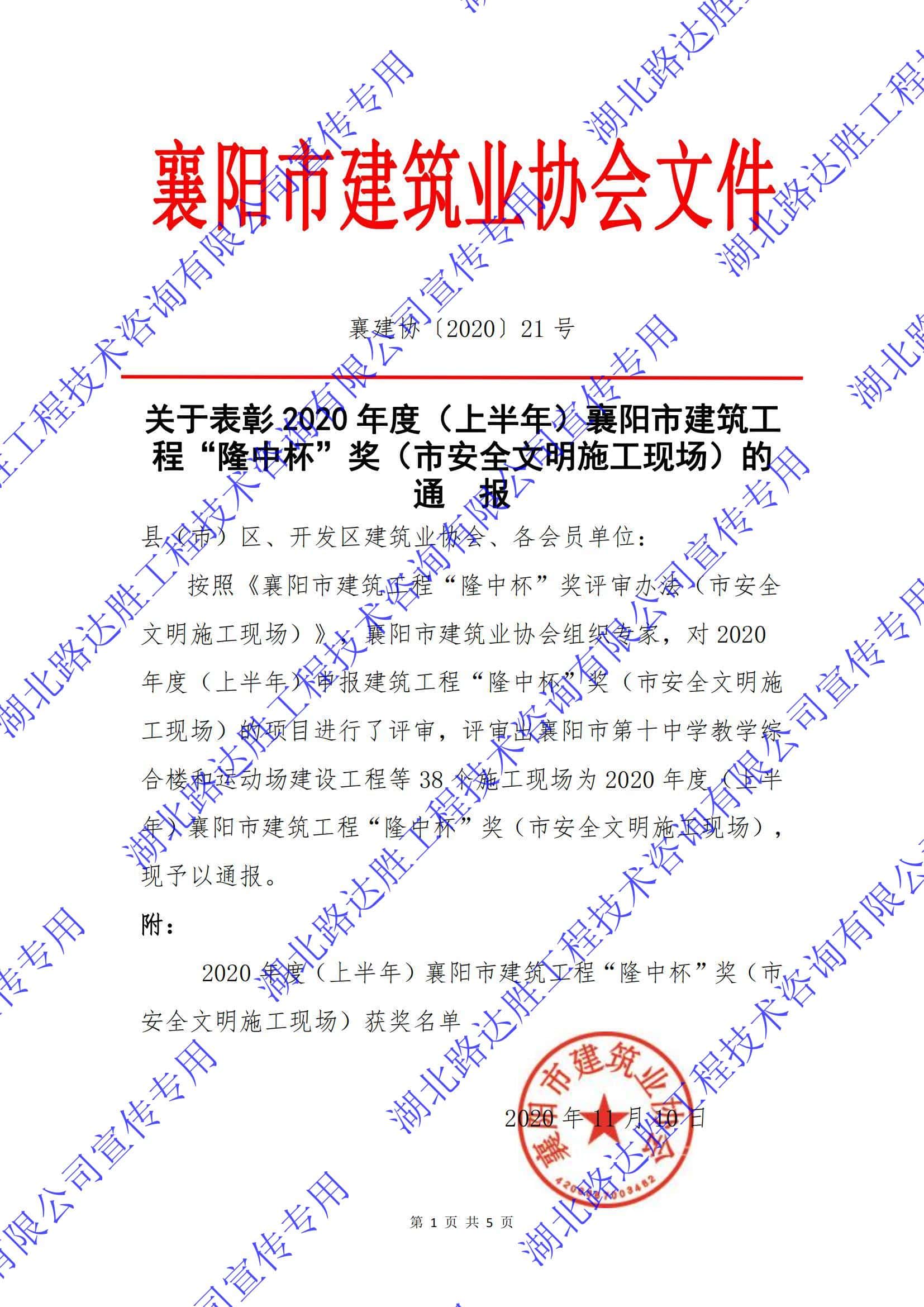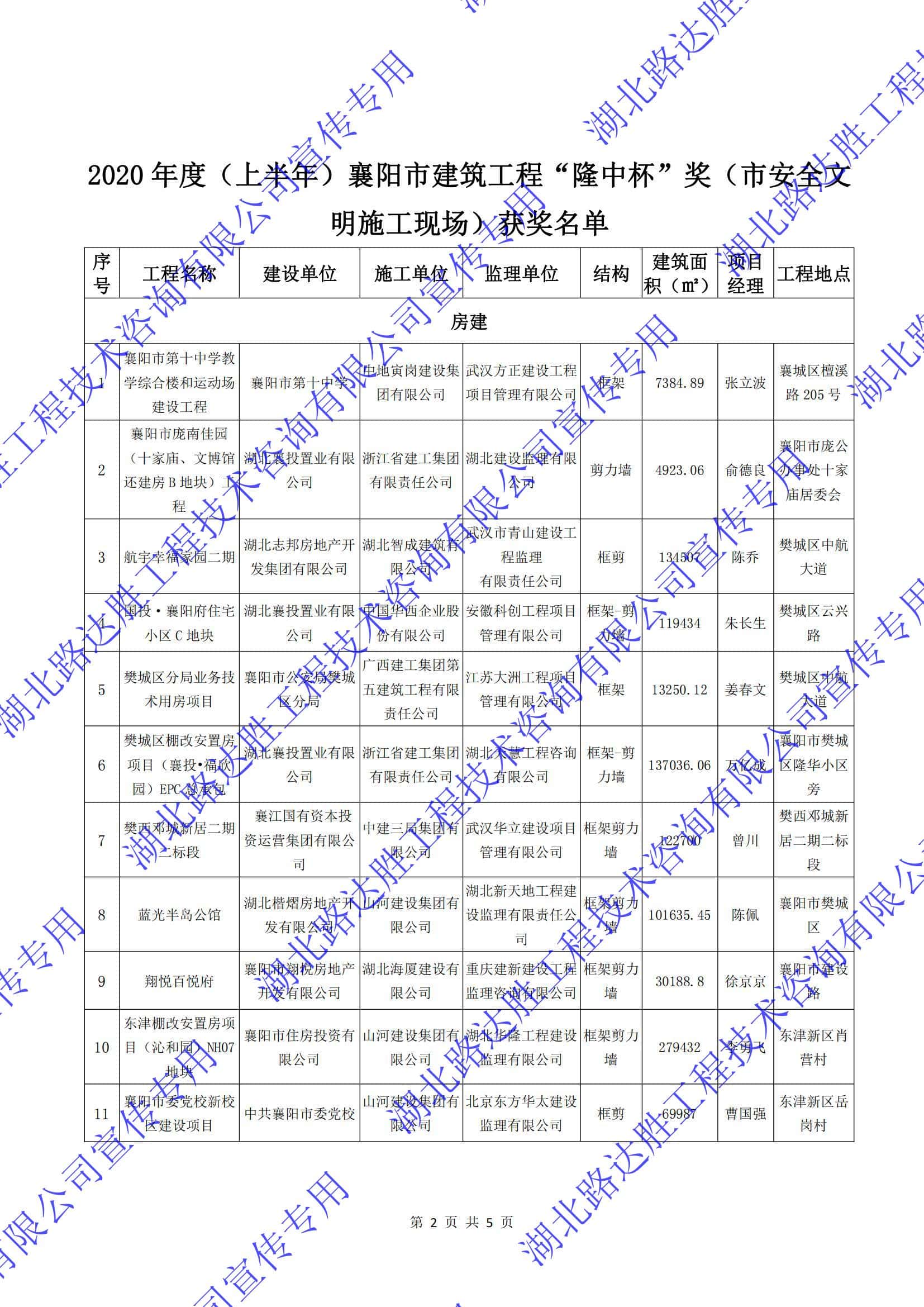 2020年度(上半年)襄阳市建筑工程“隆中杯”奖(市安全文明施工现场)