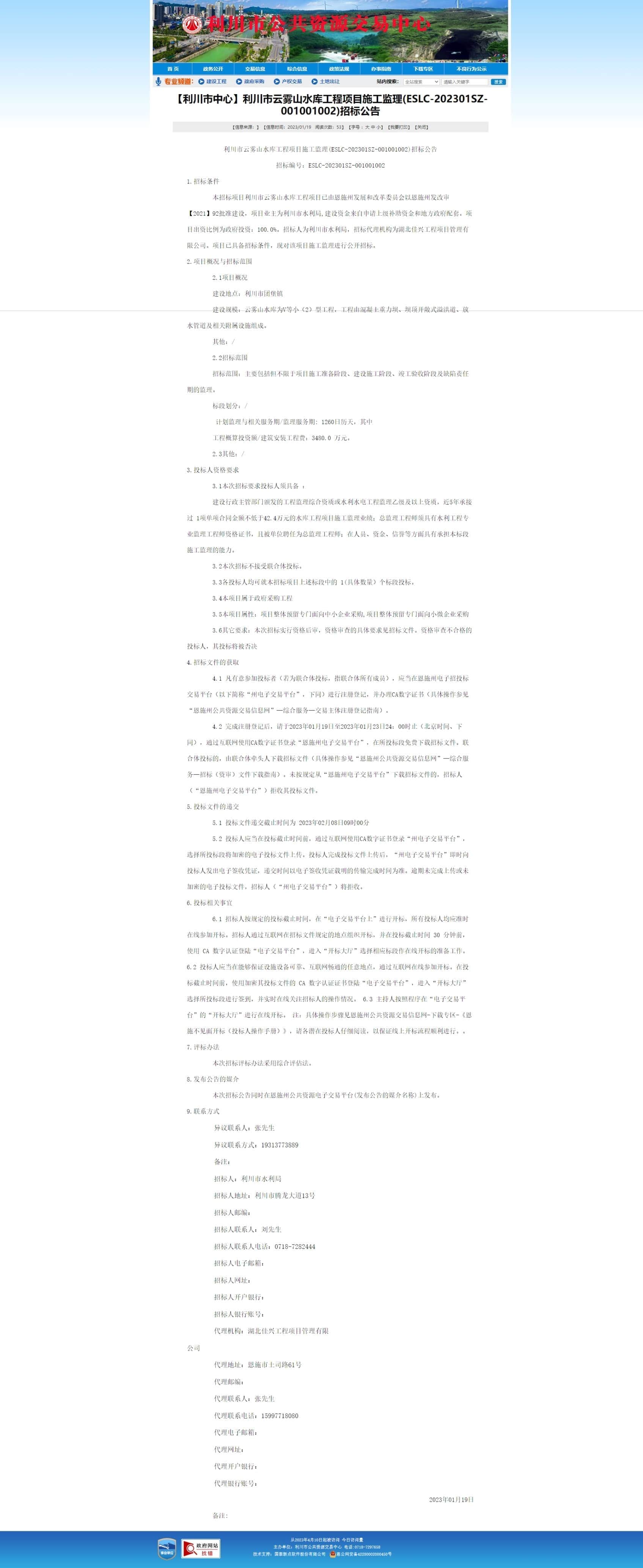 【利川市中心】利川市云雾山水库工程项目施工监理(ESLC-202301SZ-001001002)招标公告