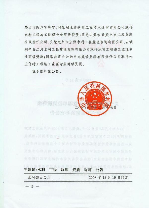 关于水利工程建设监理单位资质等级行政许可决定的补充公告