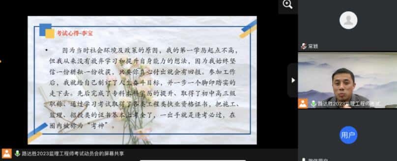 2023年2月28日下午3点,湖北路达胜工程技术咨询有限公司召开了《2023年度监理工程师考试动员视频会》,意在拓展公司业务的同时提升大家的业务水平及专业能力,让公司和员工共同学习,员工要不断地自觉创新、要主动的去超越自己,从而使公司得到可持续性发展,提高核心竞争力。公司和员工一起成长。会上还邀请了公司李总和去年一次性考过全科的李高为我们分享了学习方法及考试心得,他们的分享让备考的同事们信心百倍。