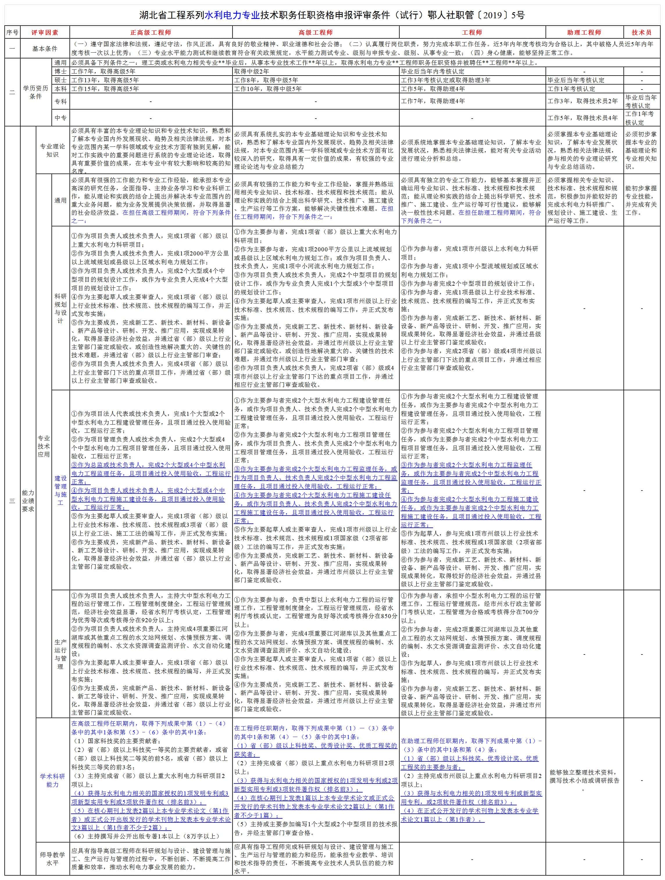 湖北省工程系列水利电力专业技术职务任职资格申报评审条件(试行)