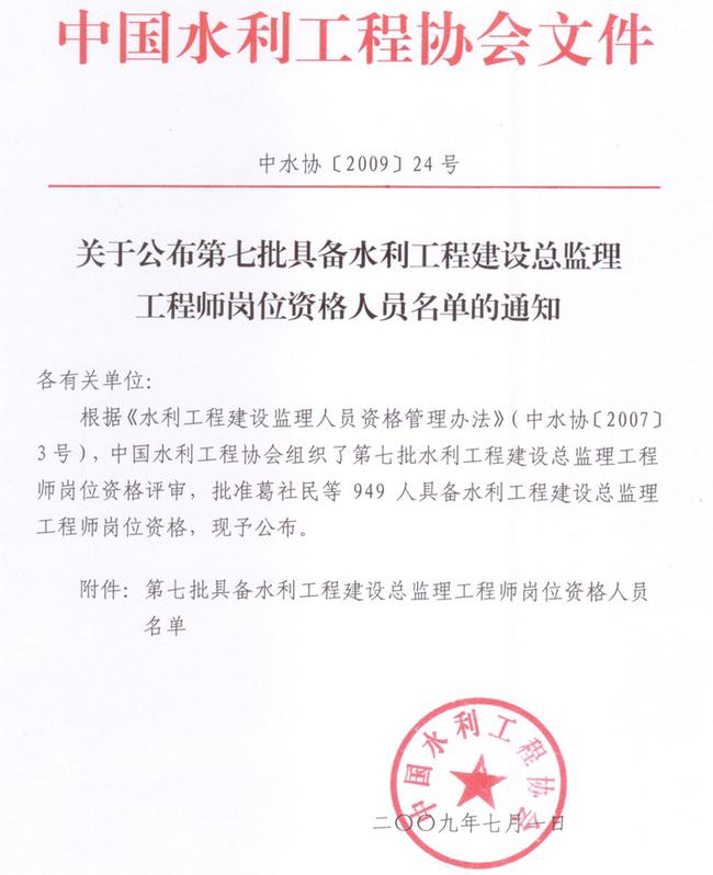 关于公布第七批具备水利工程建设总监理工程师岗位资格人员名单的通知