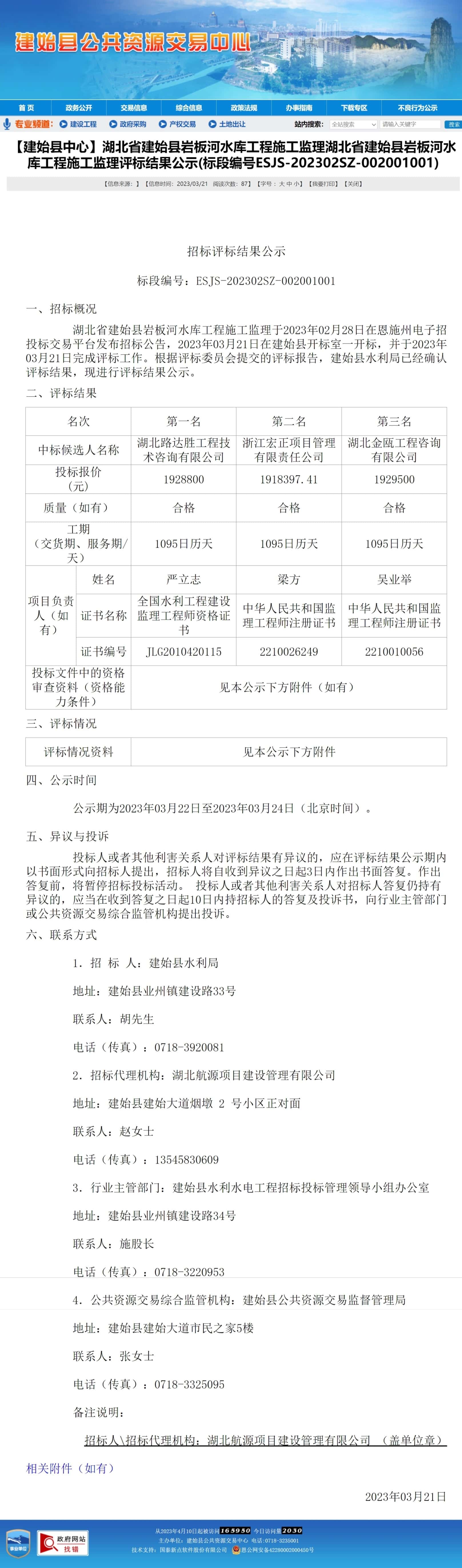 湖北省建始县岩板河水库工程施工监理于2023年02月28日在恩施州电子招投标交易平台发布招标公告,2023年03月21日在建始县开标室一开标,并于2023年03月21日完成评标工作。根据评标委员会提交的评标报告,建始县水利局已经确认评标结果,现进行评标结果公示。