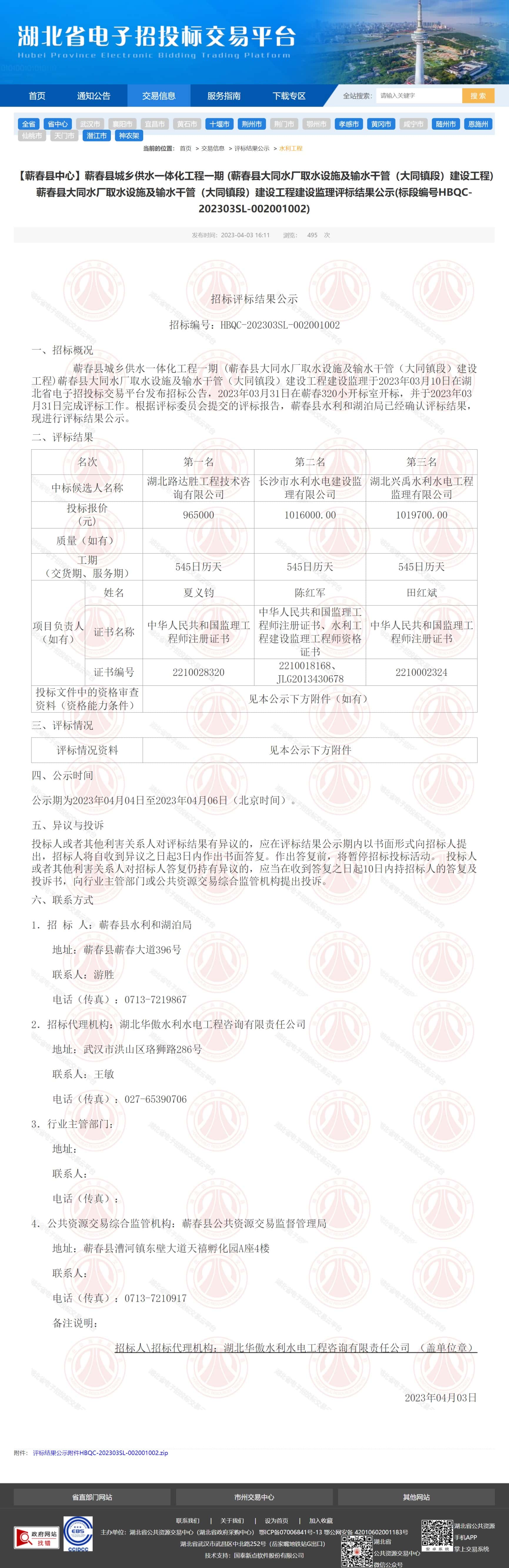 蕲春县大同水厂取水设施及输水干管(大同镇段)建设工程建设监理评标结果公示
