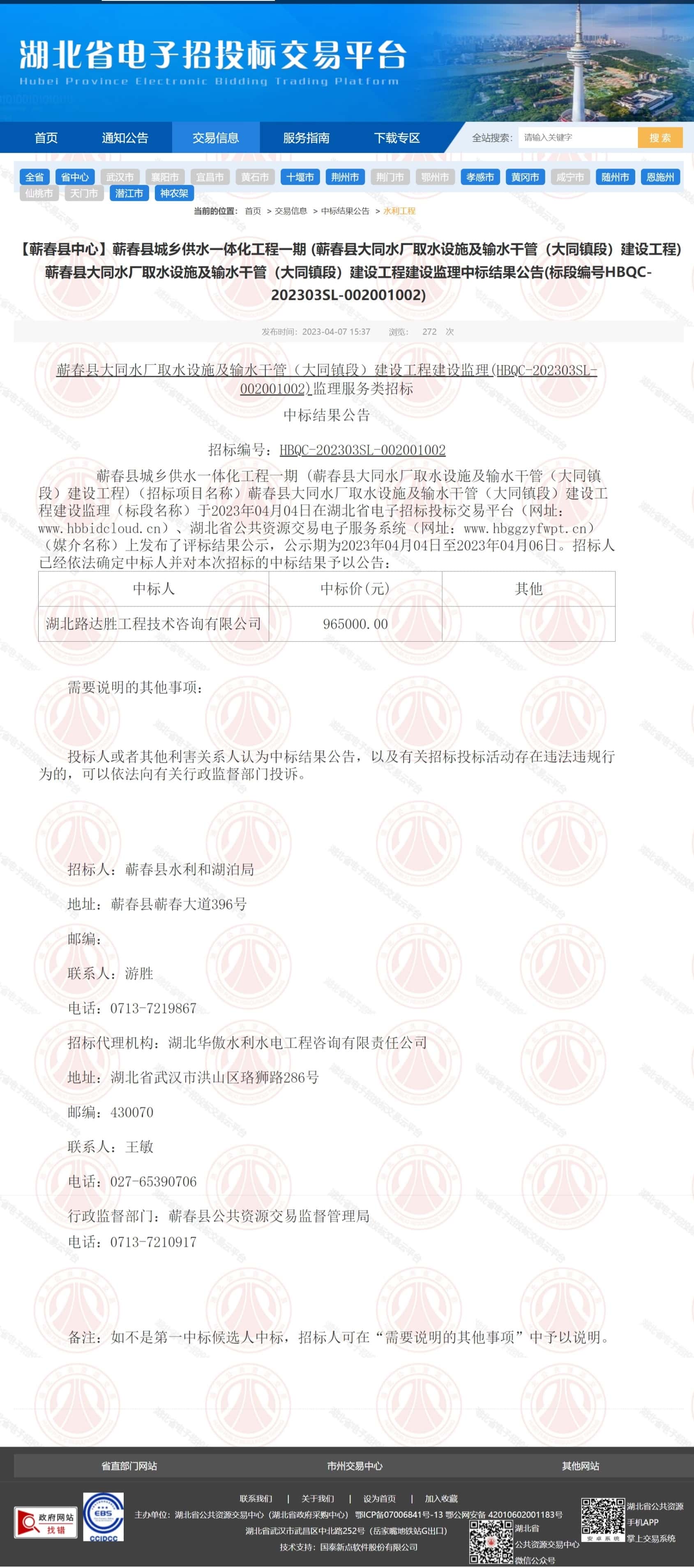 蕲春县大同水厂取水设施及输水干管(大同镇段)建设工程建设监理中标结果公告