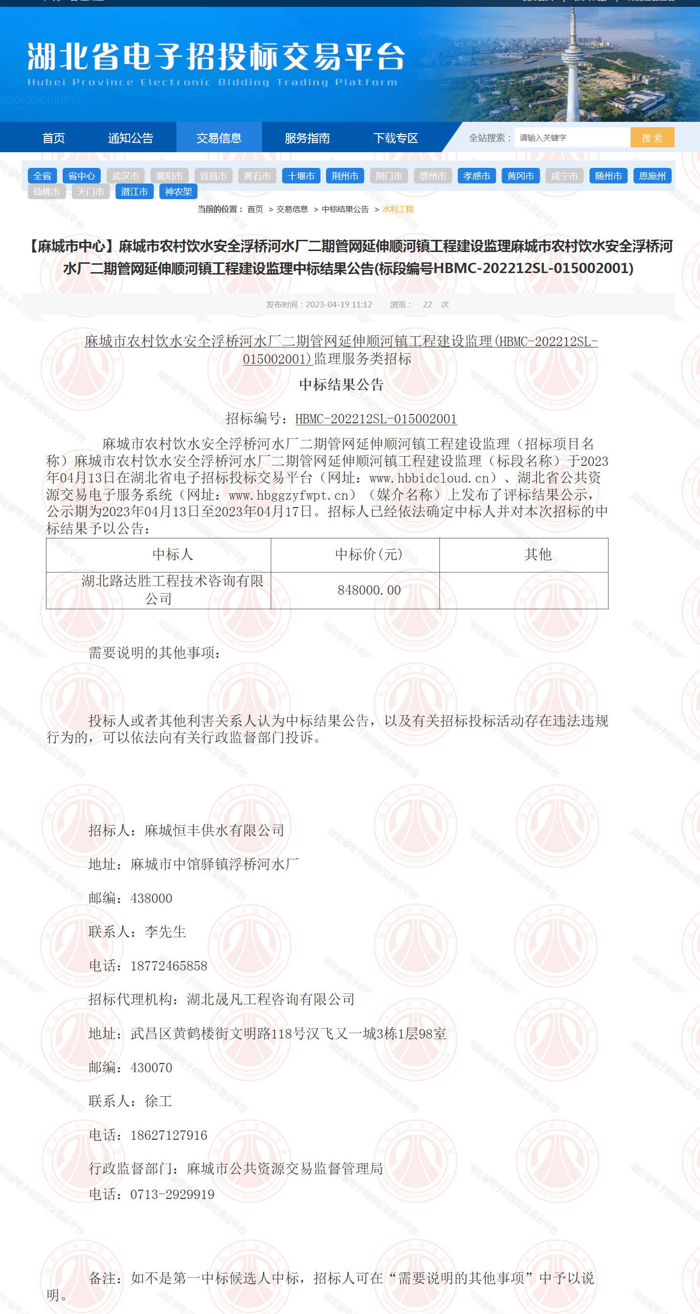 麻城市农村饮水安全浮桥河水厂二期管网延伸顺河镇工程建设监理中标结果公告