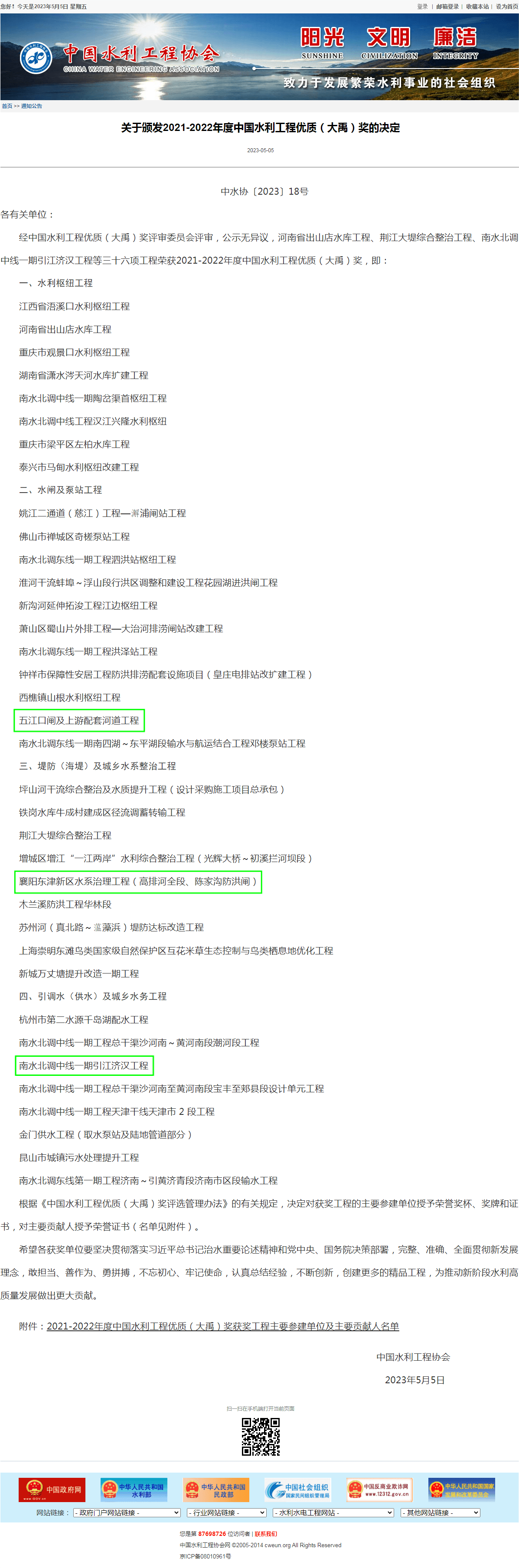 关于颁发2021-2022年度中国水利工程优质(大禹)奖的决定