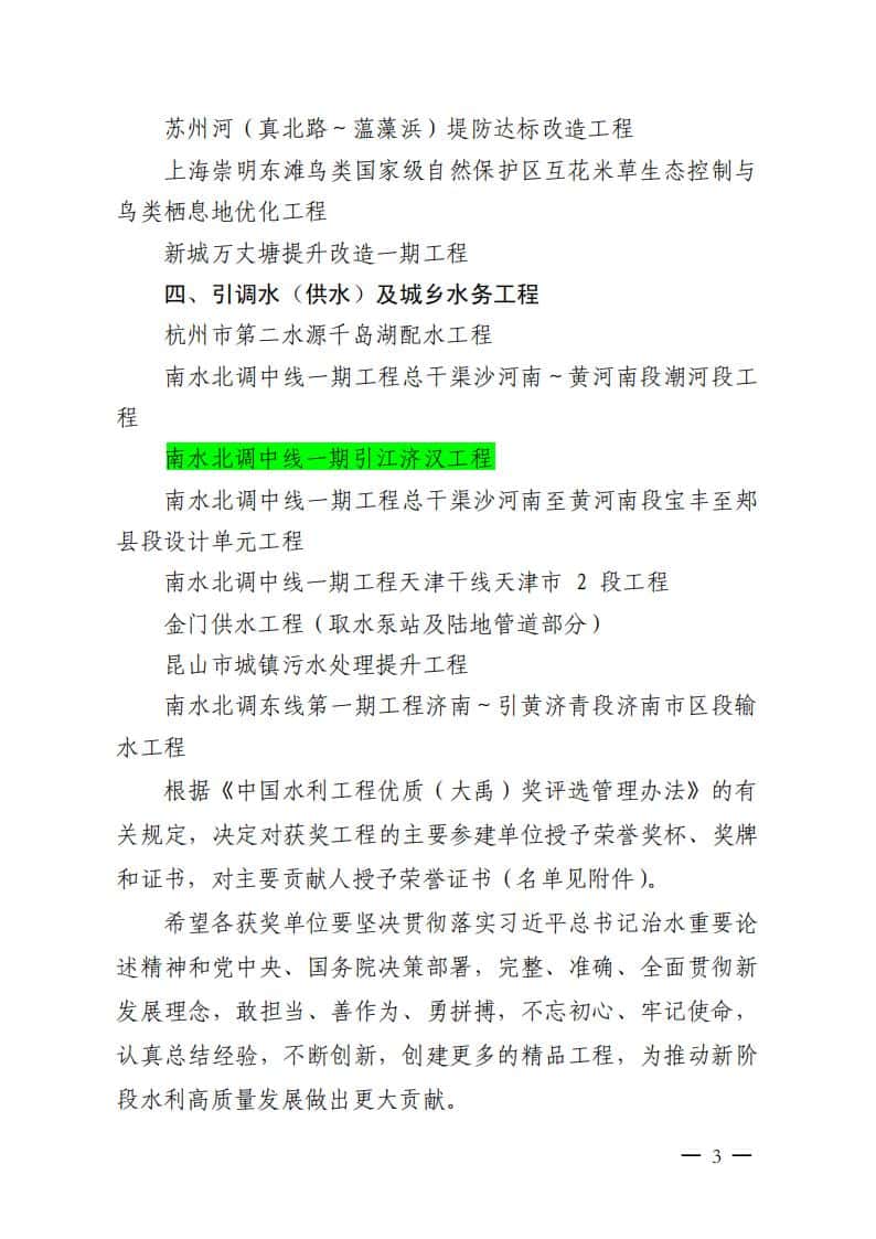 经中国水利工程优质(大禹)奖评审委员会评审,公示无异议,河南省出山店水库工程、荆江大堤综合整治工程、南水北调中线一期引江济汉工程等三十六项工程荣获2021-2022年度中国水利工程优质(大禹)奖,即: