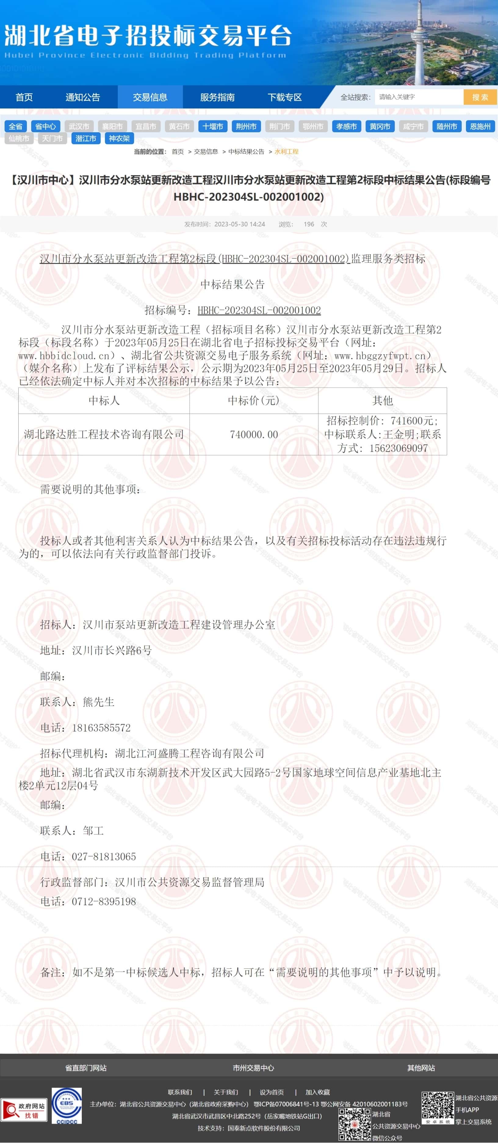 湖北路达胜工程技术咨询有限公司 740000.00 招标控制价: 741600元; 中标联系人:王金明;联系方式: 15623069097