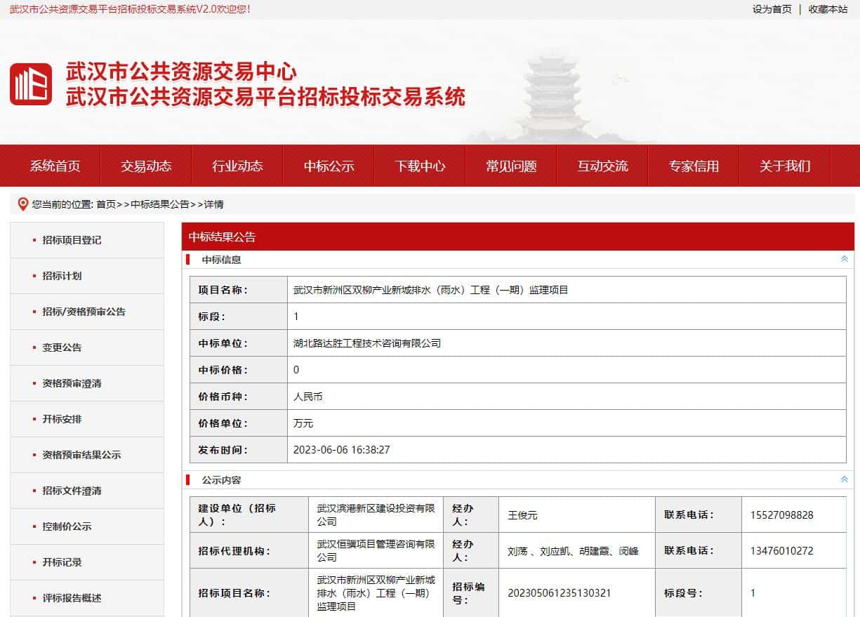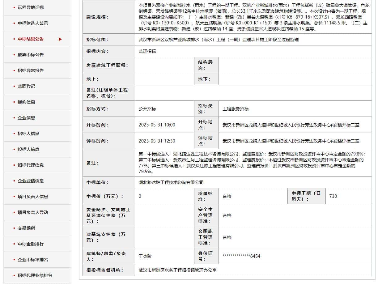 武汉市新洲区双柳产业新城排水(雨水)工程(一期)监理项目中标结果公告